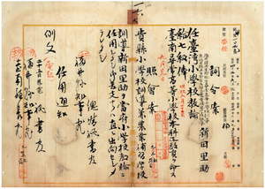 一六 台南庁長津田毅一ノ内申ニ依リ福井丹生郡糸生尋常高等小学校訓導兼福井県丹生郡糸生村立農業補習学校訓導新田里助ヲ台湾小学校教諭ニ任シ台南尋常高等小学校本科正教員ヲ命ス