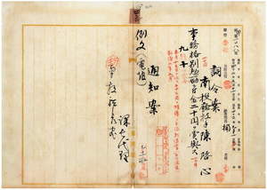 四三 南投庁長能勢靖一ノ内申ニ依リ退官ヲ出願シタル南投庁技手陳啓心ニ事務格別勉励ニ付キ一時金ヲ賞与ス