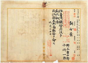 五一 台湾総督府民政部土木局長心得長尾半平ノ内申ニ依リ台湾総督府雇土木局勤務ノ野上吉十郎ト小川一郎ヲ台湾総督府技手ニ任シ台湾総督府民政部土木局勤務ヲ命ス