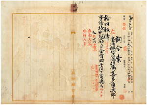 七四 台湾総督府民政部通信局長持地六三郎ノ内申ニ依リ入院治療中危篤ノ台湾総督府通信属喜多勇次郎ニ昇級ノ上事務格別勉励ニ付キ一時金ヲ賞与ス