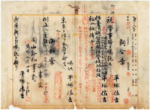 二 台湾総督府民政部総務局長山田新一郎ノ内申ニ依リ岡山県女子師範学校教諭兼岡山県立岡山高等女学校教諭平塚佐吉ニ視学事務ヲ嘱託シ(九月二〇日発令)東京ヲ経テ出府ヲ命シ(九月一〇日付)、台湾総督府国語学校助教授ニ任ス