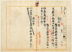 五四 塩水港庁長朝倉菊三郎ノ内申ニ依リ塩水港庁六甲支庁長ヲ命セラレタル塩水港庁警部小山哲二ニ明治四〇年六月内訓第五号台湾総督府職員加俸増加内規ニ基キ支庁長勤務中加俸月俸十分ノ七ヲ給シ(一〇月二一日付)嘉義庁警部ニ任ス(一〇月二四日付)