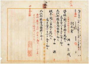五七 台湾総督府民政部殖産局長代理福留喜之助ノ具申ニ依リ廃官ニ伴ヒ元苗栗庁技手酒井宗成ニ営林ニ関スル事務ヲ嘱託シ民政部殖産局勤務ヲ命シ、元斗六庁技手中西潔ニ移住民ニ関スル事務ヲ嘱託シ民政部殖産局勤務ヲ命ス