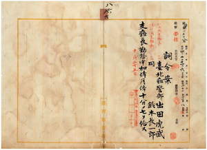 八六 水返脚支庁長台北庁警部出田虎武及ヒ頂双渓支庁長台北庁警部鈴木長一郎ニ支庁長勤務中加俸月俸十分ノ七ヲ給ス[内申書なし]