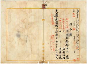 八七 台中庁長枝徳二ノ内申ニ依リ彰化支庁長台中庁警部中川清・東勢角支庁長台中庁警部岩村慎吾・二林支庁長台中庁警部吉津吉治ニ支庁長勤務中加俸月俸十分ノ七ヲ給ス