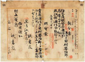 一 台湾総督府民政部通信局長持地六三郎ノ内申ニ依リ逓信省通信手田村要治郎ヲ台湾総督府通信手ニ任シ民政局通信局勤務ヲ命ス(1909-10-07~1909-11-19);貯金局長ヨリ台湾総督府通信局長ヘ田村要治郎ノ採用月日給料等伺ノ件(1909-12-08~1909-12-12)