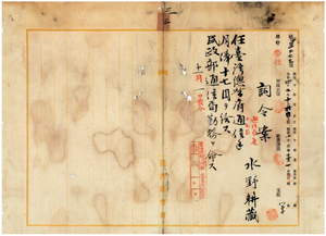 三 台湾総督府民政部通信局長持地六三郎ノ内申ニ依リ台湾総督府通信局雇水野耕蔵ヲ台湾総督府通信手ニ任シ民政部通信局勤務ヲ命ス