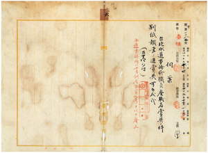 六 台北水道事務所長高橋辰次郎ノ内申ニ依リ水道事務所ハ一〇月訓令第一六七号ヲ以テ廃止ニ付キ退職セシムヘシノ雇立山直助ト傭ノ前野関一郎・高山喬・安村朝庸ニ平素勉励ニ付キ賞与ノ件