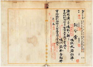 一五 台湾総督府民政部通信局長持地六三郎ノ内申ニ依リ大阪府下富田林ニ於ケル台湾総督府電柱丹灯注入工事終了ノ為メ嘱託大岩弘平ヲ御用済ニ付キ嘱託ヲ解キ事務格別勉励ニ付キ一時金ヲ賞与シ、嘱託岩本喜輪平ニ事務格別勉励ニ付キ一時金ヲ賞与ス