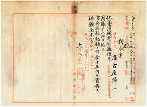 二三 台湾総督府雇古屋帰一ハ徴兵入営ノ為メ辞職願提出ニ伴ヒ、台湾総督府通信局長持地六三郎ノ内申ニ依リ通信局採用以来事務勉励成績優秀将来嘱望ノ為メ、台湾総督府通信手ニ任シ事務格別勉励ニ付キ一時金ヲ賞与ノ上本官ヲ免ス