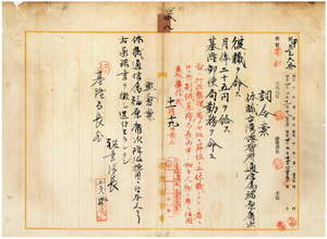 四八 基隆郵便局長松本平太郎ノ内申ニ依リ行政整理ノ為メ昇級ノ上休職トナリタル台湾総督府通信属福原庸次ニ降級採用ニ付キ復職ヲ命シ基隆郵便局勤務ヲ命ス