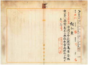 四二 台北庁長井村大吉ノ内申ニ依リ台北第一小学校勤務台湾小学校教諭嵩原安佐ニ台北第一尋常高等小学校長事務取扱ヲ命ス