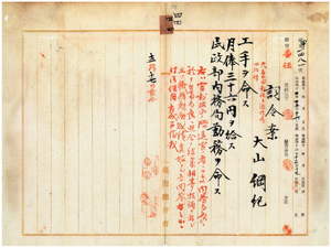 四四 台湾総督府民政部内務局長川村竹治ノ内申ニ依リ元台南郵便局通信属大山綱紀ニ工手ヲ命シ民政部内務局勤務ヲ命ス