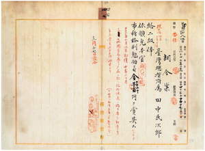 四七 台湾総督府属田中民次郎ハ熱帯性赤痢ニ罹リ職ニ堪ヘサル旨ヲ以テ退官願ニ依リ昇級ノ上本官ヲ免シ事務格別勉励ニ付キ一時金ヲ賞与ス