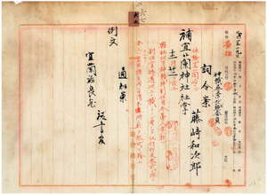 六七 明治三四年三月七日建設認可同四一年六月本殿並ニ拝殿落成シタル宜蘭神社ノ社掌ニ付キ宜蘭神社氏子総代二宮夘一ト林沢蔡ヨリノ推薦願ト宜蘭庁長中田直温ノ副申及宜蘭庁長小松吉久ノ申出ニ依リ一〇月中ニ休職ヲ命シタル宜蘭庁属藤崎和次郎ヲ宜蘭神社社掌ニ補ス
