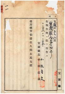 一一 第一四号 台湾総督府官制第一一条ニ依リ宜蘭庁管内ニ宜蘭庁坪ト林尾支庁ヲ設置シ其ノ位置及ヒ管轄区域制定ノ件(1909-10-25);明治四二年一〇月宜蘭庁令第一四号ハ明治四二年一〇月府令第七六号ニテ認可済ニ付キ庁令ヲ発スル必要無キ旨宜蘭庁長ヘ通達ノ件(1909-11-19~1909-12-18)