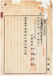 一四 第一五号 明治四二年九月宜蘭庁訓令第一二号隘勇線配置定員改正ノ件(1909-12-25~1910-02-24);宜蘭庁・新竹庁・台中庁・南投庁・嘉義庁ノ訓令供閲ノ件(1910-01-25~1910-02-24)