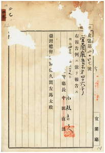 二三 第四六号 宜蘭庁本城堡宜蘭街林以時ヘ阿片烟膏請売営業並ニ阿片烟膏吸食所営業ヲ特許ノ件