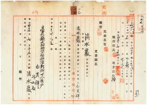 一三 台北市大加蚋堡崔崢祖師廟前街地ノ清水巌業地ハ崔崢市区改正道路線ニ該当スルニヨリ其ノ筋ノ買上命令ニ従ヒ同地ヲ売渡スコトトシ管理人白其祥ト信徒総代ノ白灼恒・黄世務ヨリ売渡願ニ付キ許可ノ件