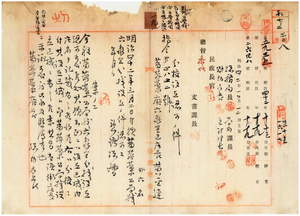 一九 人民総代蕃薯リョ庁六亀里区庄長黄金連・山杉林区庄長呂保生・阿里関区庄長黄旺・溝坪区庄長何発・蕃薯リョ区庄長陳順和・渓洲区庄長陳星輝・裾濃区庄長呉連生ヨリ出願ノ蕃薯リョ庁楠梓仙渓東里六亀里庄ニ薯リョ公学校六亀里分校設立ニ付キ認可並ニ阿緱庁長佐藤謙太郎ヨリ同校ノ校舎及職員宿舎ノ平面図ノ原図紛失ニ付キ謄写ノ為メ右図面貸与方依頼ノ件