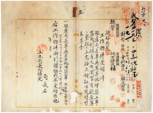 五 台湾総督府民政部殖産局長専属室及其他増築工事落成引継ニ付キ官有財産簿ヘ登記ノ上殖産局長ヨリ土木局長心得ヘ工作物受領証ヲ交付スルノ件