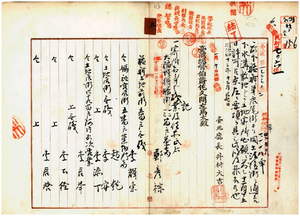 五 台北庁長井村大吉ヨリ稟申ノ台北庁下崔崢草店尾街ヨリ同土地後街ニ通スル下水溝敷地トシテ鄭彦棕・李輝東・趙匏・李安・李添丁・李君挙・李公銓・李君啓・李君稼・魏氏環凉・林氏好凉・徐氏證凉・呉育仁・呉育港・辛善甫・朱定枝・黄朝錦ヨリ寄附願ニ付キ認可ノ件