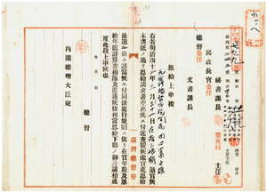 二六 明治四二年三月三一日付ヲ以テ脚気等ニ罹リ職ニ堪ヘサル旨ヲ以テ退官セル元淡水税関勤務台湾総督府税関属田口富士雄ヘ恩給証書下付ノ件[松井又一郎に対する内閣恩給局より台湾総督官房宛の恩給証書送付通知書あり]