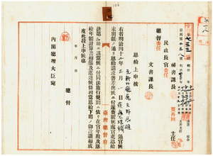 二七 明治四二年三月一日付ヲ以テ疾病ニ罹リ職ニ堪ヘサル旨ヲ以テ退官セル元新竹庁属矢野辰雄ヘ恩給証書下付ノ件[中瀬秀二郎・河野悦次郎・野田繁太郎に対する内閣恩給局より台湾総督官房宛の恩給証書送付通知書あり]