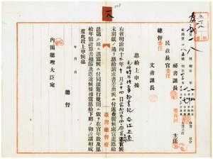 一八 官制改正ニ付キ廃官ノ為メ元臨時台湾工事部総務課兼部長専属勤務臨時台湾工事部書記安江正直ヘ恩給証書下付ノ件