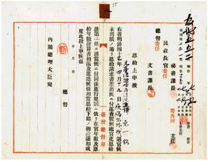 八 麻刺利亜ニ罹リ退官ノ元台南地方法院勤務台湾総督府法院通訳兼書記原一鶴へ恩給証書下付ノ件