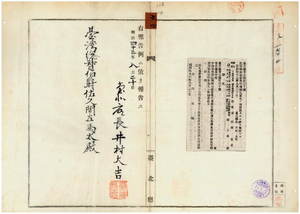 六四 第一三〇号 台北庁大加蚋堡崔崢書院辺街黄銭ハ物品販売業行商鑑札遺失ニ付キ該鑑札ヲ無効トス