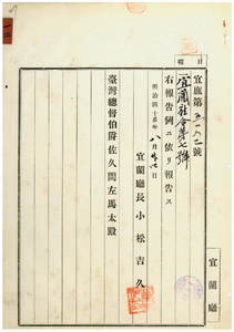 一二 第七号 明治四一年九月律令第一四号台湾害虫駆除予防規則第三条ニ依リ稲田ニ於ケル浮塵子・鉄甲亀虫ノ駆除予防区域及ヒ施行期日制定ノ件