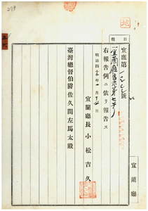 五六 第七号 宜蘭庁羅東堡羅東街ヲ豚疫流行地ト認メ豚ノ出入並ニ病毒伝播ノ虞アル物品ノ搬出入ヲ停止スル件