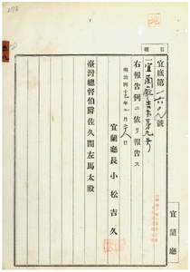 五八 第九号 明治三九年三月宜蘭庁令第一四号第一条ニ依ル貸座敷営業指定地制定ノ件