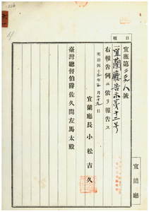 六一 第一二号 台湾阿片令施行規則ニ依リ宜蘭庁紅水溝堡冬瓜山庄沈重華ニ阿片烟膏請売営業特許ノ件