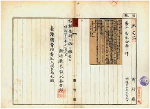 二九 第九五号 新竹庁管内ノ竹北二堡中崙庄入来院豊熊ト苗栗一堡大湖庄呉楊麟ヘ銃猟免状下付ノ件