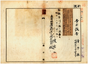 八五 第八五号 明治三八年九月台中庁令第一〇号蕃人ニ対スル物品供給ノ取締ニ関スル施行細則ニ依ル台中庁師東上堡大茅埔庄羅成再ヨリ蕃産物交換所開設廃止届ノ件