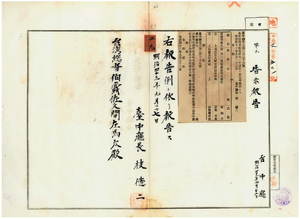 二九 第二二九号 台中庁管内ノ猫羅堡阿罩霧庄林如川及ヒ藍興堡台中街ノ岩崎民蔵ト山根慶次郎ハ自転車鑑札紛失ニ付キ該鑑札ヲ無効トス