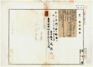 五二 第二五二号 台中庁藍興堡五張犂庄李江盛所有ノ支那形船錦火及ヒ錦盆ノ船鑑札紛失ニ付キ該鑑札ヲ無効トス