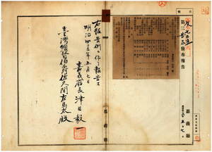 二 第二二号 嘉義庁管内ノ大苛田堡五間扱庄・同堡大墩仔庄・打猫南堡柳仔溝庄・鹿仔草堡中リョ庄・尖山堡蔡扱庄・大怒榔西堡大怒榔庄・同堡樸仔脚街・鹿仔草堡中リョ庄・同堡鹿仔草庄・大怒榔西堡小怒榔庄ニ牛疫及ヒ嘉義西堡嘉義街ニテ豚疫発生ノ件