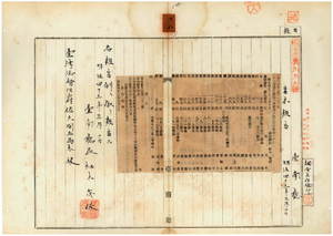 三八 第二二号 台南庁学甲堡渡仔頭庄ノ李起・李尚・郭香・郭到・陳長・顔精・蔡土餓・蔡燕、同庁同堡渓底リョ庄ノ侯鉄・曽鞍心・曽庄・侯里・林相・黄盤・侯主・黄罷・許伺・林扶・許珎・黄栽・呉金盛・謝相・謝秀・陳牛礼・蔡存所有ノ竹筏ノ船鑑札紛失届ニ付キ該鑑札ヲ無効トス
