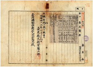 一八 第一八号 台南庁管内ノ水寧里喜樹庄蔡金記所有ノ支那形船金順成、大竹里苓雅リョ庄陳文所有ノ支那形船合利、旗後街ノ駱配・許桂及ヒ魚隆内里塩花埔庄蔡朝所有ノ支那形艀船、永寧里湾裡庄ノ黄様・鄭喜所有ノ竹筏、効忠里安平街顔済生所有ノ支那形船金廉興ノ船鑑札紛失ニ付キ該鑑札無効ノ旨台南庁ヨリ通知ノ件