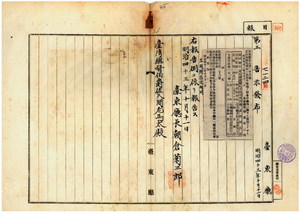 二六 第二六号 台中庁大肚上堡高美庄李成枝所有ノ支那形船金順利及ヒ宜蘭庁利沢簡堡蘇澳庄董添所有ノ支那形漁船ノ船鑑札流失ニ付キ該鑑札無効ノ旨両庁ヨリ通知ノ件