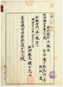 澎湖廳告示第三十二號臺南廳ヨリ獸疫發生通知ノ件