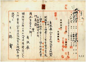 二 南投庁長久保通猷ヨリ公共営造物中市場及屠畜場ノ設置区域改正ニ関スル稟申ニ対シ認可ノ件(指令第六〇三〇号)