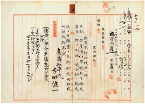 五 元広島県安芸郡江田島高等小学校代用教員台北庁台北東門街在住寺田健一ノ台湾小学校本科正教員無試験検定出願ニ付キ教員免許状授与ノ件