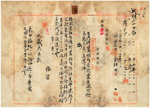 一九 台北庁台北文武街ノ株式会社台湾貯蓄銀行専務取締役頭取荒井泰治ヨリ出願ノ同行定款変更ニ付キ大蔵大臣ヘ進達並ニ大蔵大臣桂太郎ヨリ認可及ヒ認可書台北庁長ヘ通牒ノ件