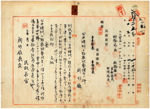 五 新竹庁長家永泰吉郎ヨリ公共埤圳圳路敷地トナス為メニ土地ノ分割又ハ地目ノ変換ノ場合特例的ニ公共埤圳組合管理者ヨリ土地整理ヲ申請セシメ台湾地租規則取扱心得ニ依リ整理致シ度シトノ稟申ニ対シ地租規則施行規則ニ於ケル申告ヲ要セサル条件ハ政府ノ施行スル道路・鉄道線路・溝渠・用悪水路・河川堤防等ノ工事ニ限定セラレルモノナルヲ以テ同庁稟申ノ件ハ認可シ難キ旨通達ノ件