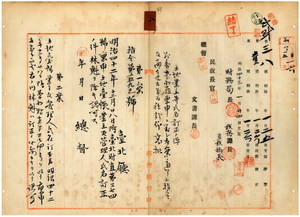 八 台北庁長井村大吉ヨリ稟申ノ土地台帳業主及管理人氏名ニ付キ台北庁芝蘭三堡滬尾街土名九坎街・同堡同庄土名永吉街ノ許林氏束ヲ許林氏速ヘ、擺接堡永和庄土名崇蕉脚ノ林彬ヲ林家邦ヘ大加蚋堡上介悠庄ト同堡崔崢大渓口街及ヒ同堡項内埔庄ノ黄環凉ヲ黄氏環ヘ、石碇堡三爪仔庄土名員山仔ノ劉秤ヲ劉氏秤ヘ、芝蘭三堡老梅庄土名老崩山ノ李元章ヲ李茂廷ヘ訂正方認可ノ件並ニ大加蚋堡大稲花朝東街ノ林魁ニハ不認可ノ旨通達ノ件(指令第一五九三号)