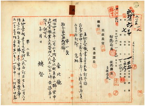 九 台北庁長井村大吉ヨリ稟申ノ土地台帳業主及管理人氏名ニ付キ台北庁大加蚋堡崔崢蓮花街ト同堡崔崢厦新街ノ林心匏ヲ林万生ヘ・林咾ヲ林邁ヘ・林漫岸ヲ林邁ヘ、石碇堡社后庄土名社后下ト大加蚋堡東新庄仔庄ノ林賢順ヲ林順ヘ、芝蘭二堡竹仔湖庄ノ高来福ヲ高来屋ヘ、文山堡陂内坑庄土名石壁坑ノ高様ヲ高禄ヘ高蕩ヲ高獅ヘ、芝蘭三堡滬尾街土名東興街ノ江最ヲ江烏蕃ヘ、大加蚋堡崔崢粟倉口街ノ戴添林ヲ戴添ヘ訂正方認可ノ件並ニ大加蚋堡崔崢大厝口街ノ黄栄華ヘ不認可ノ旨通達ノ件(指令第一五九四号)
